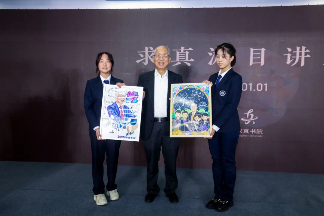 复旦附中的张佳宜同学为丘先生送上了自己创作的两幅肖像画,并为丘先生介绍了画作的寓意。其中一幅表达了对丘先生在科研中取得的成果和做出的贡献的敬意,另外一幅表达了对丘先生心系青年学子,关怀数学教育的感激和敬意,画作上的桃花和李花则寓意着丘先生桃李满天下。
