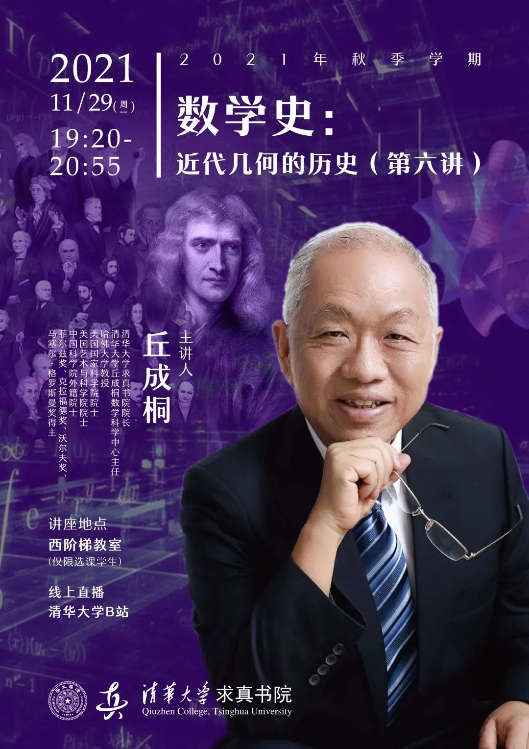 主讲人:丘成桐,美国科学院院士、美国艺术与科学院院士,中国科学院外籍院士,俄罗斯科学院外籍院士,台湾中研院院士,哈佛大学数学系和物理系终身教授,清华大学数学科学中心主任,教育部依托清华大学成立的丘成桐数学科学中心主任,威尼斯人娱乐场 院长。先后获得菲尔兹奖、麦克阿瑟(MacArthur)奖、克拉福德(Crawford)奖、沃尔夫(wolf)奖、马塞尔·格罗斯曼(Marcel Grossmann)奖。