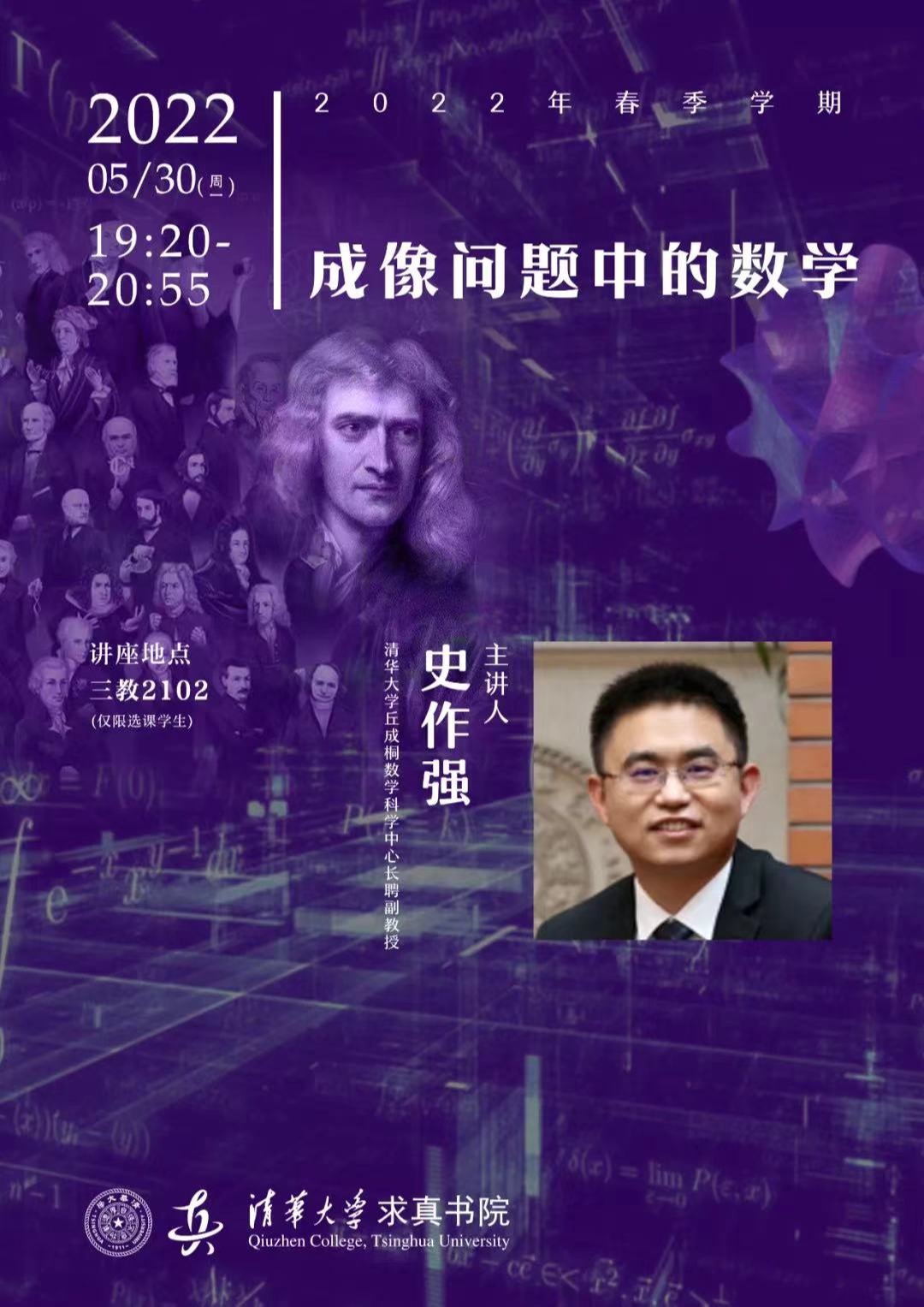 史作强,清华大学丘成桐数学科学中心长聘副教授,主要研究方向为偏微分方程数值方法,图像处理和机器学习中的微分方程模型,非线性非平稳信号时频分析等,在ACHA,SIAM系列期刊,Advances in Mathematics,ARMA等国际知名学术期刊发表文章50余篇。